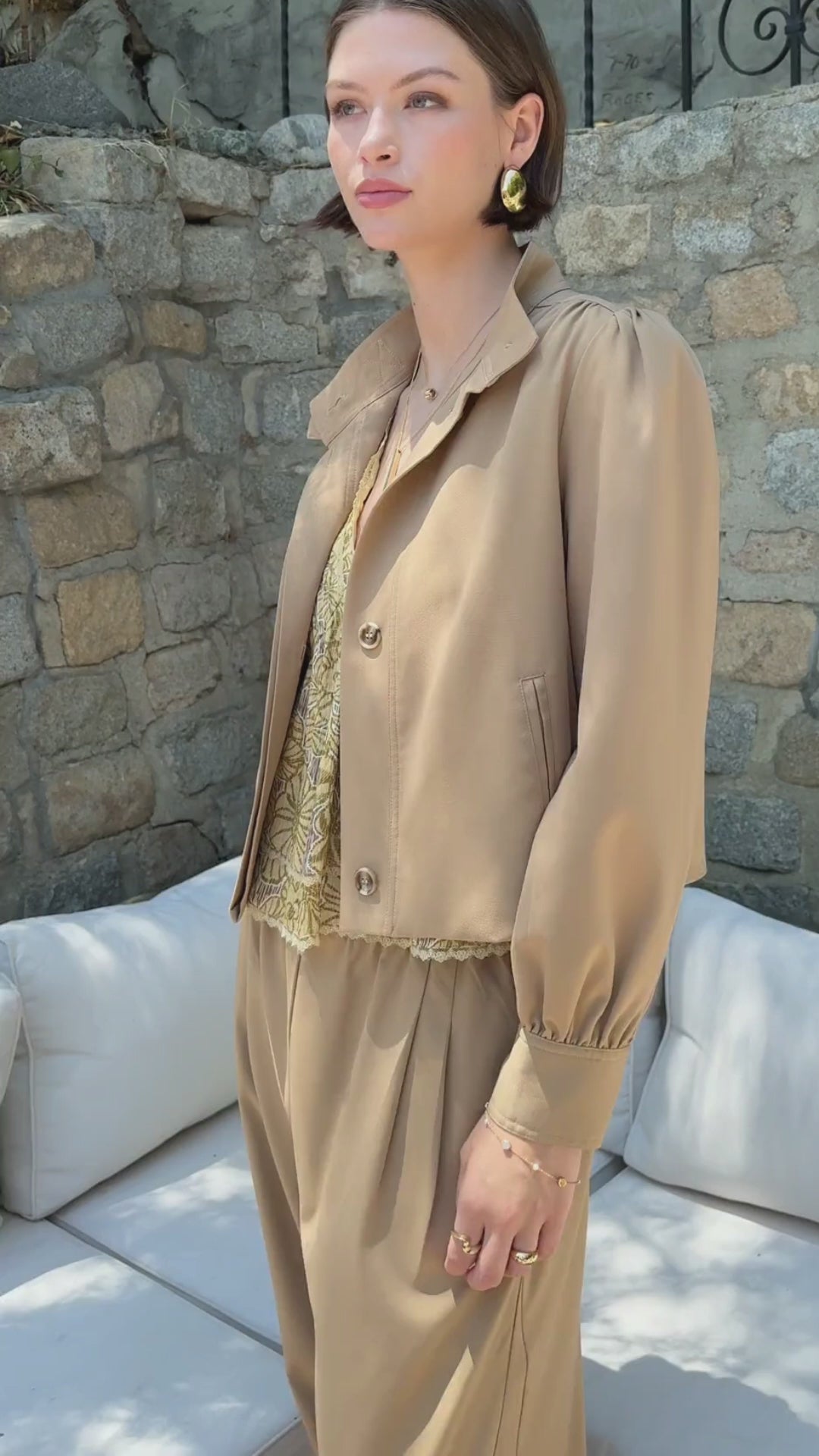 Rendered in a sophisticated, earthy Taupe, the Alexa jacket is defined by its clean-lined mock neck, which provides a statuesque, face-framing effect when fully closed. Crafted from a high-quality, lightweight fabric—often a technical nylon blend or a crisp cotton poplin—this jacket is designed to provide a protective layer against light breezes and air conditioning while remaining breathable.