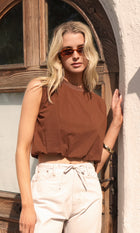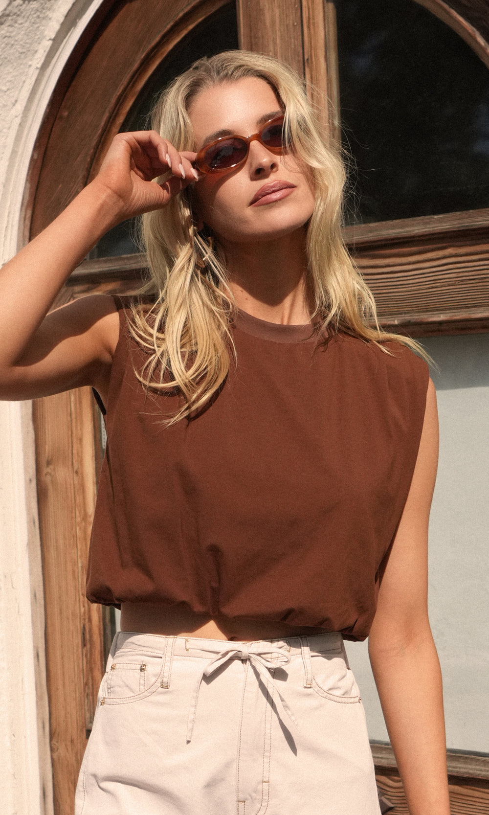 Crafted from a soft and stretchy jersey knit fabric, it drapes beautifully and allows for ease of movement. The top features a contemporary crew neckline and is distinguished by its subtle yet impactful padded shoulders, which create a structured and elevated look.