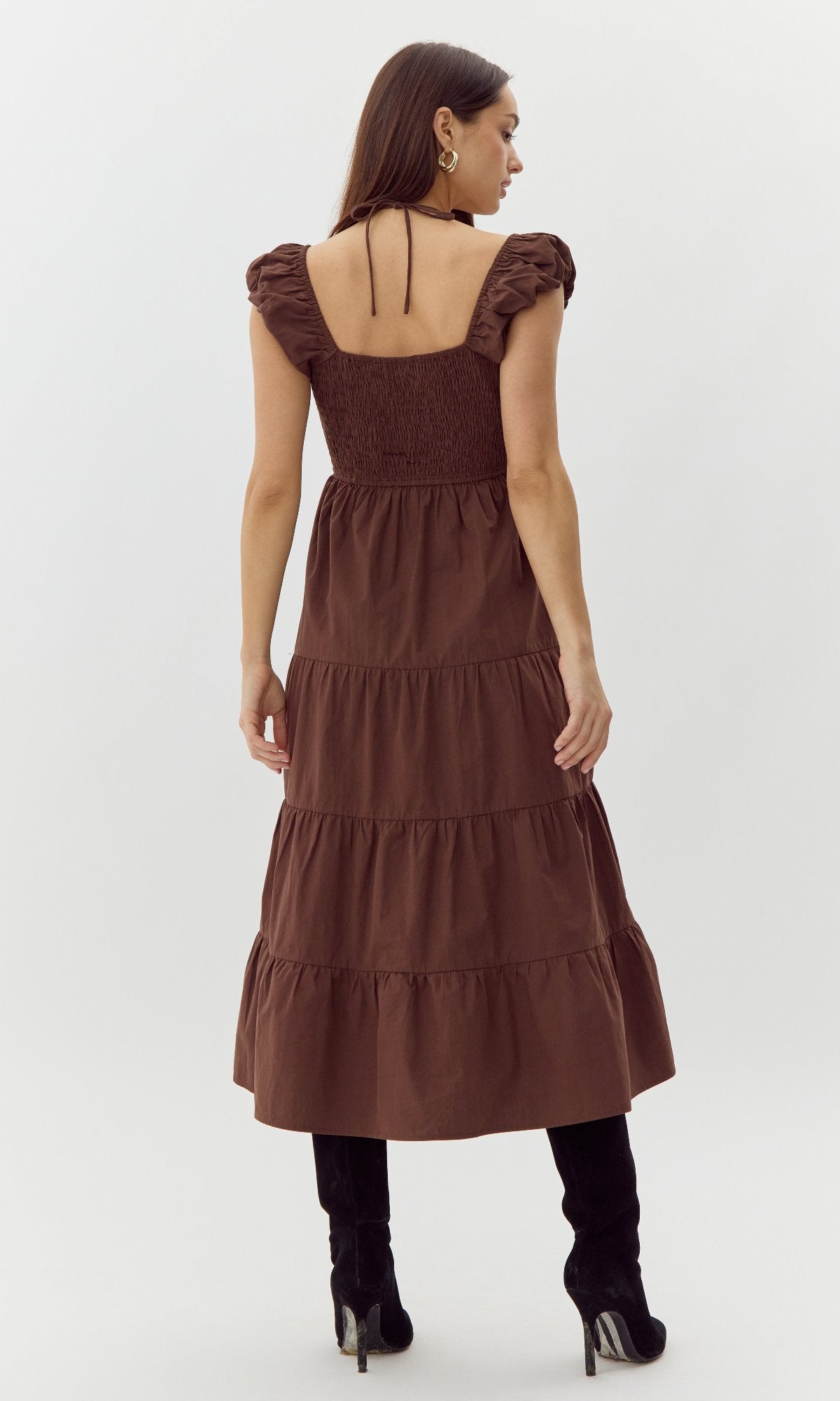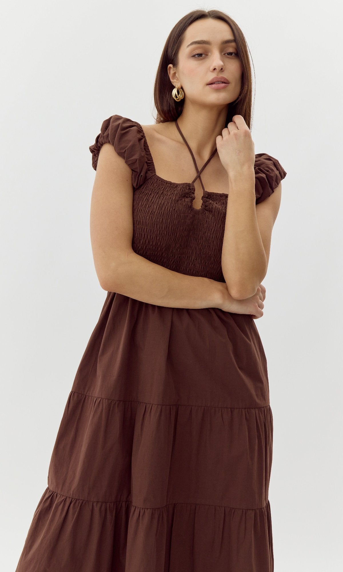 This mid dress features cap sleeves, a smocked bodice, and halter tie. It's finished with hidden pockets and a tiered skirt.