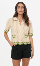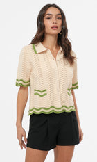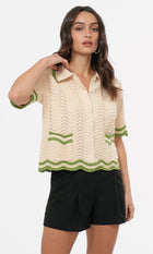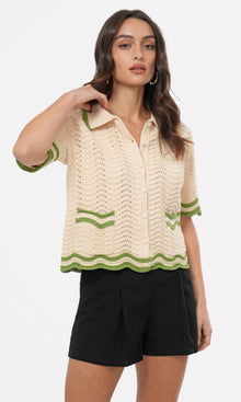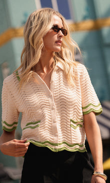 This collared button-up cardigan features a scalloped knit texture in cream, punctuated with striped green trim for a crisp, retro pop. The boxy fit and short sleeves keep it fresh and breezy, while the wave pattern adds interest to even the most minimal styling. Style it with tailored shorts, slouchy denim, or layer it over a slip dress for a cool