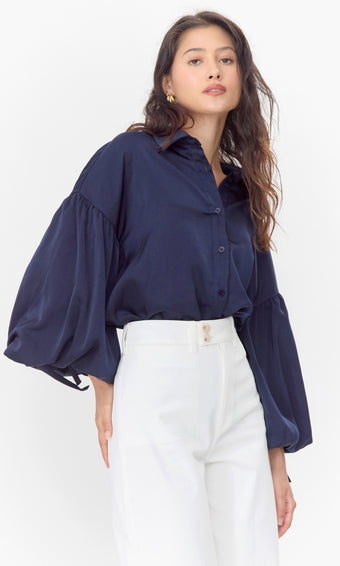 Button-up shirt defined by it's bold balloon sleeves. The sleeves can be tied with strings attached.