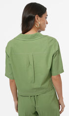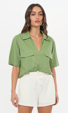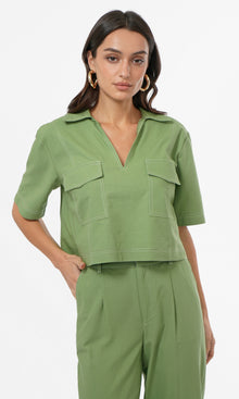 Crisp lines and a boxy silhouette give the Cecilia Shirt a polished yet easy feel. Designed with flap chest pockets, contrast topstitching, and a notched collar, it’s a fresh update on the everyday button-up. Cut from a breathable cotton blend in a soft sage green. Part of a matching set with the Cecilia Pants.