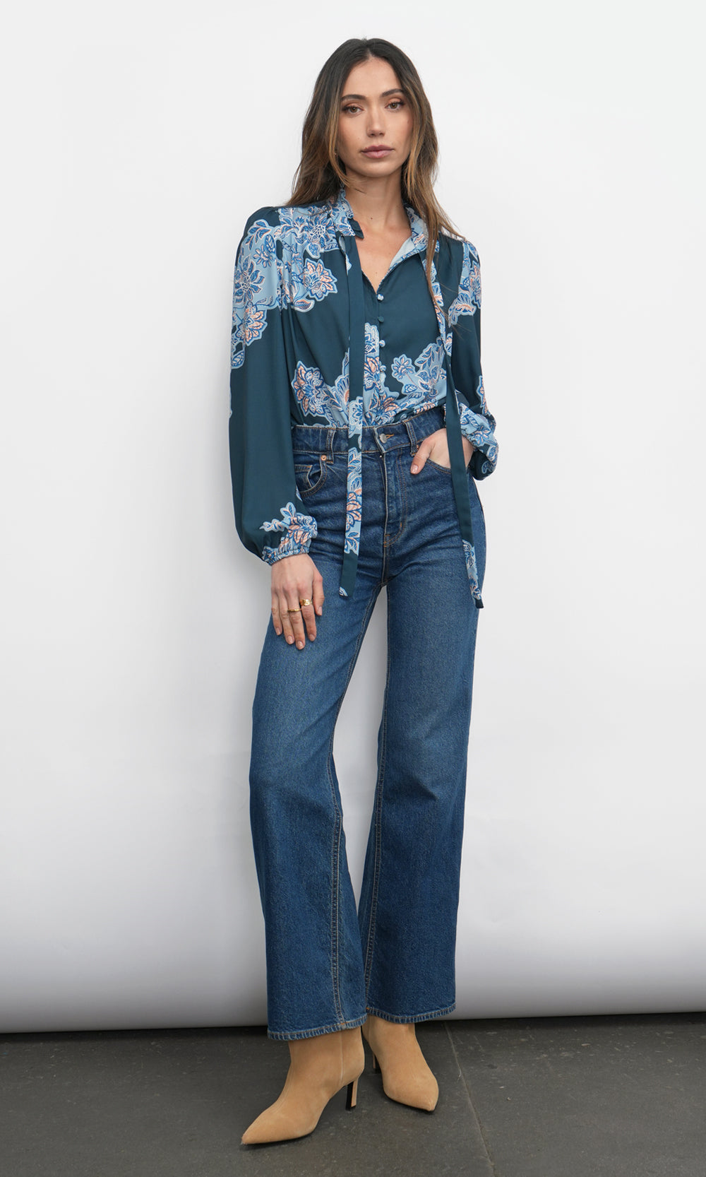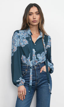This elegant long-sleeve blouse is adorned with a captivating floral or paisley-inspired print in an array of harmonious blues, soft pinks, and crisp white, set against a rich teal or deep green backdrop. Designed with a relaxed, flowing fit, it features a classic button-up front and a versatile tie-neck detail that can be styled in a bow or left undone for a more relaxed look.