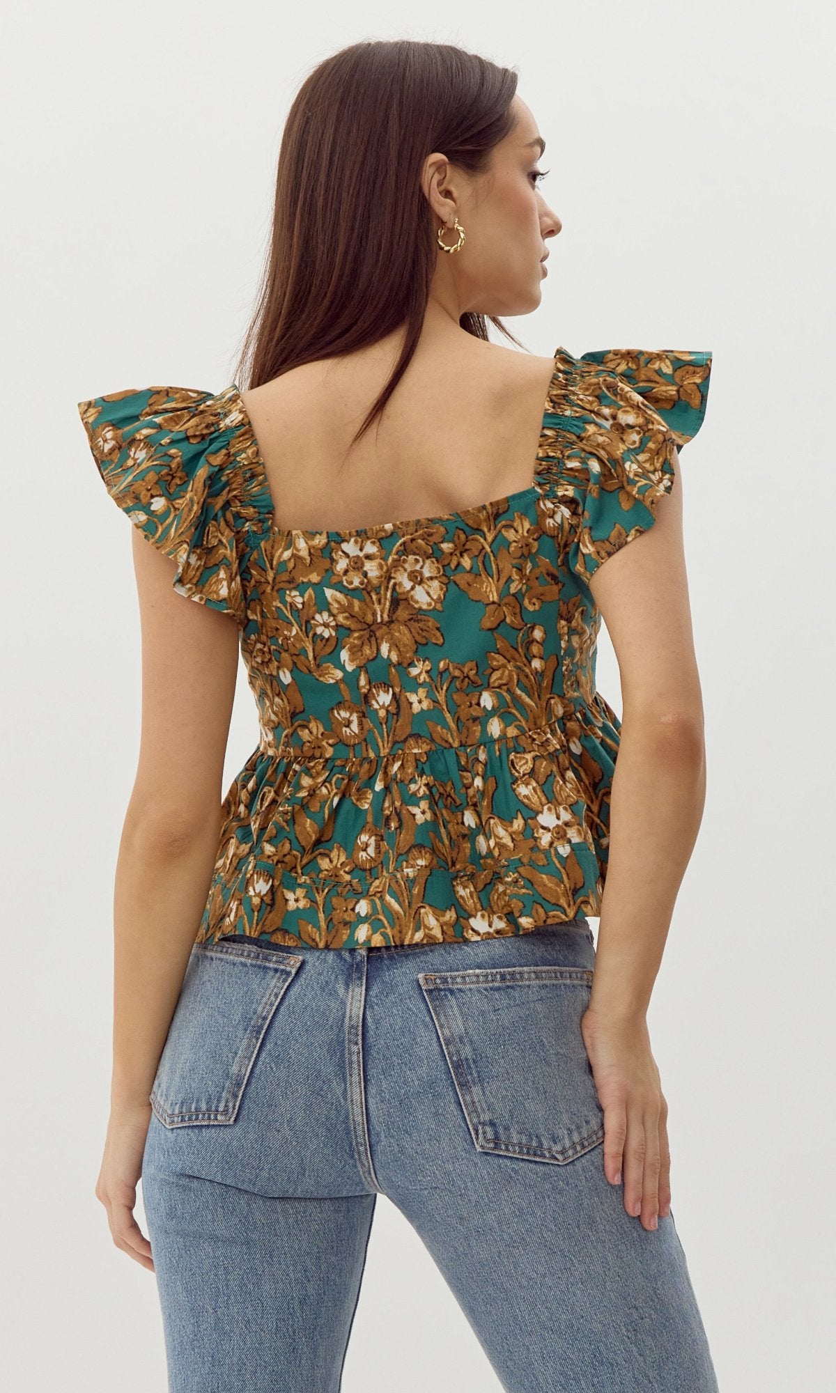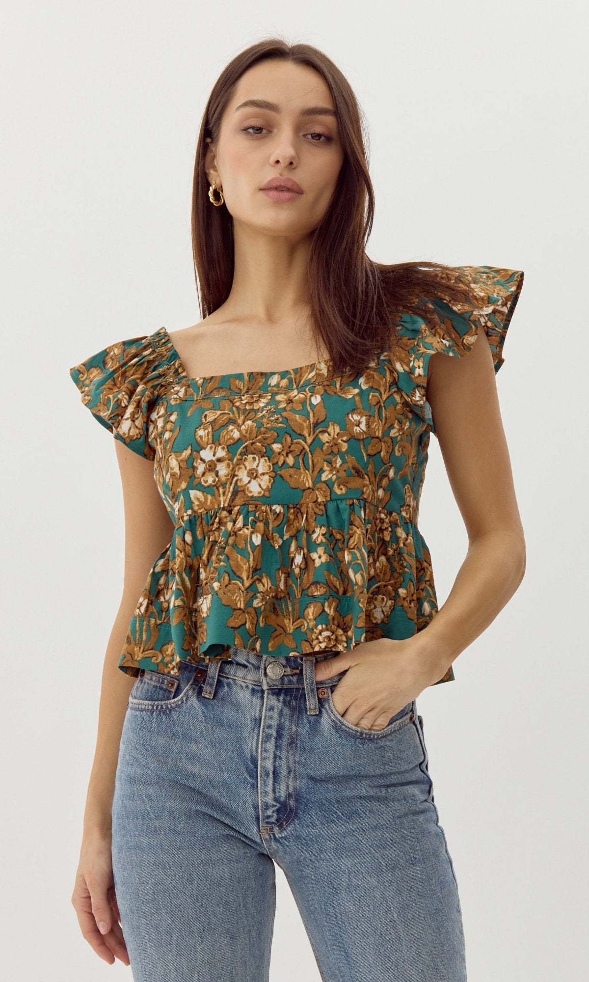 Floral blouse in a peplum structure featiring a square neckline and ruffled shoulders.