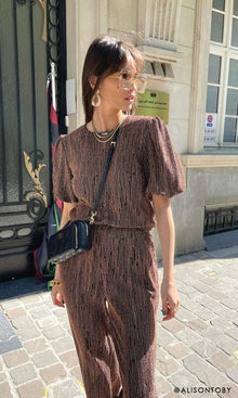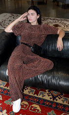 Luxe stretch knit fabric with a coppery rose gold lurex threading stripe. Lounge in style in our wide leg, elastic waist pant