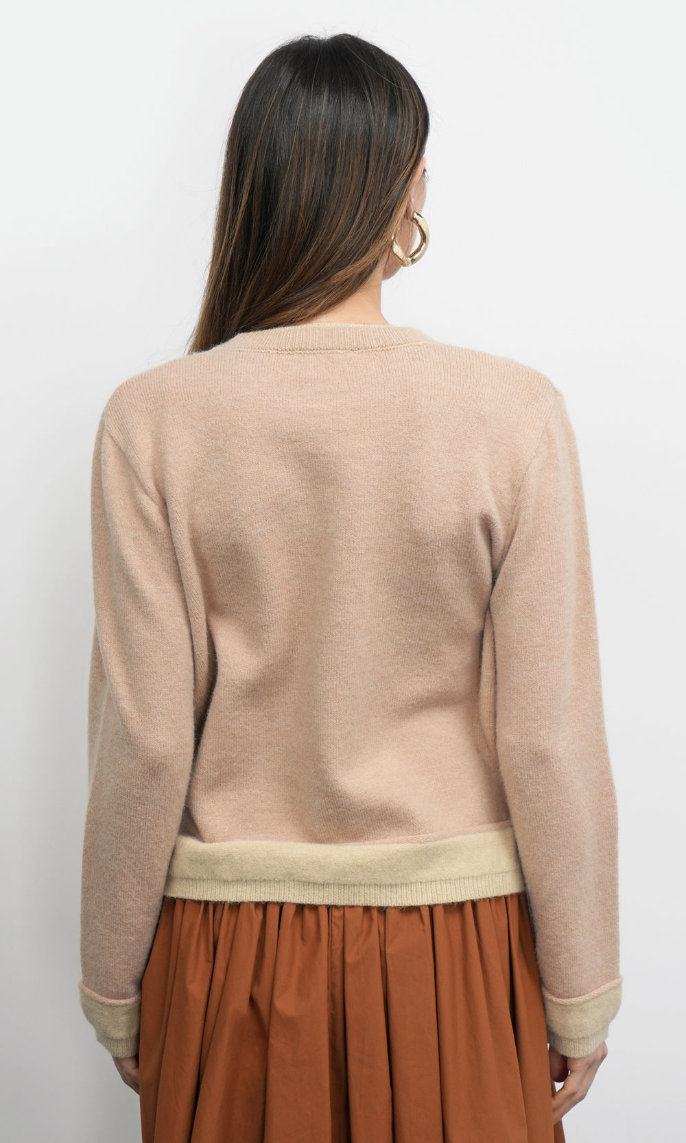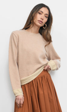 Crafted from a luxuriously soft and inviting knit, this sweater is designed for ultimate coziness without compromising on elegance. It features a classic crew neckline and a relaxed fit, made distinctive by its sophisticated two-toned design: a subtle, lighter contrasting hue graces the ribbed cuffs, adding a refined touch to the overall warm beige or camel tone.