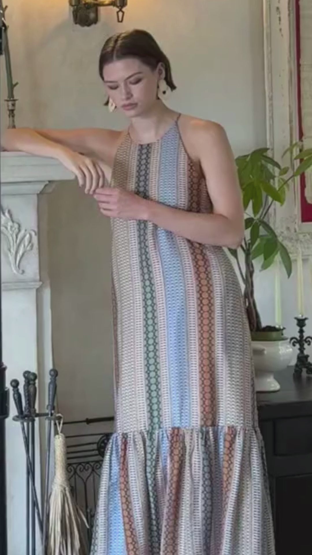 Presented in a rich and artistic Brown Combo, the Faith dress features a sophisticated print that blends chocolate, umber, and toasted tones—perfect for those who lean into an organic, "earth-goddess" aesthetic. The front of the dress offers a clean, streamlined neckline that flows into a graceful midi-length skirt with a subtle flare.