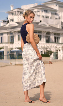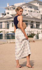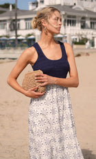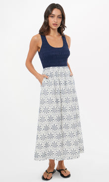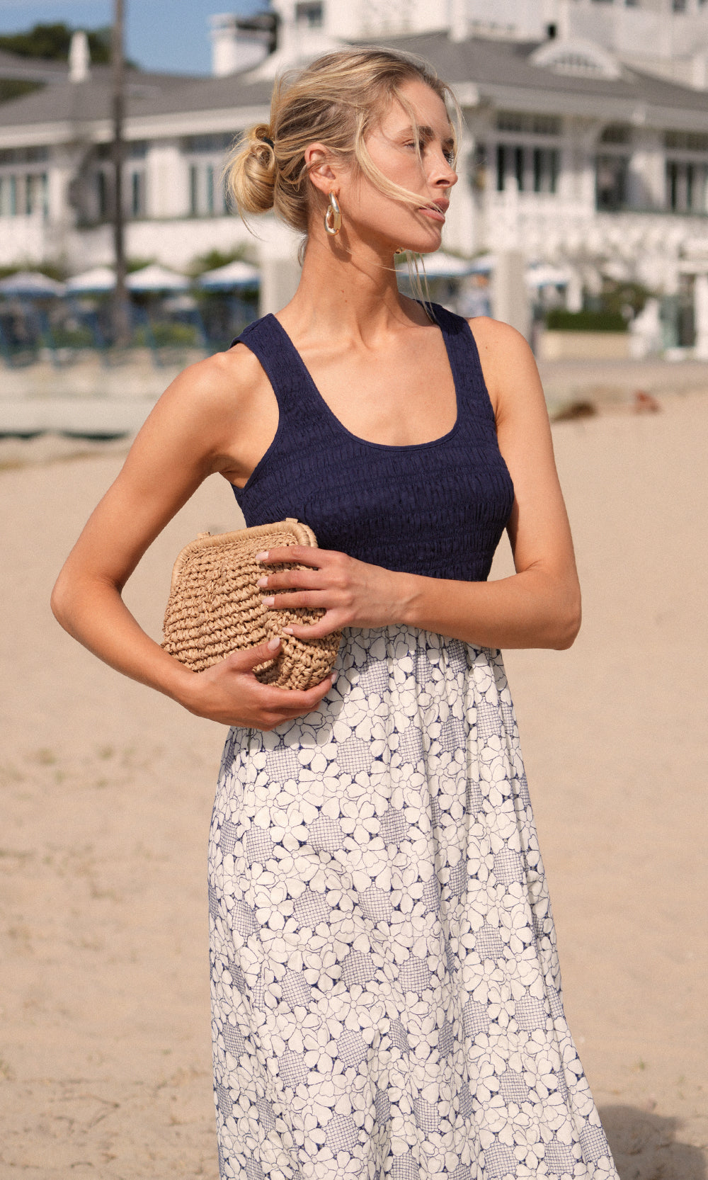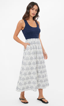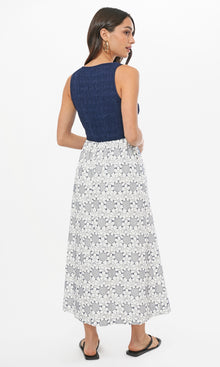 This midi dress features a distinctive two-tone design, with a solid-colored (likely navy) smocked bodice that offers a flattering, fitted silhouette and comfortable stretch. The smocking adds a textural element and ensures a great fit. The lower half of the dress transitions into a flowing midi skirt crafted from a beautiful embroidered fabric.