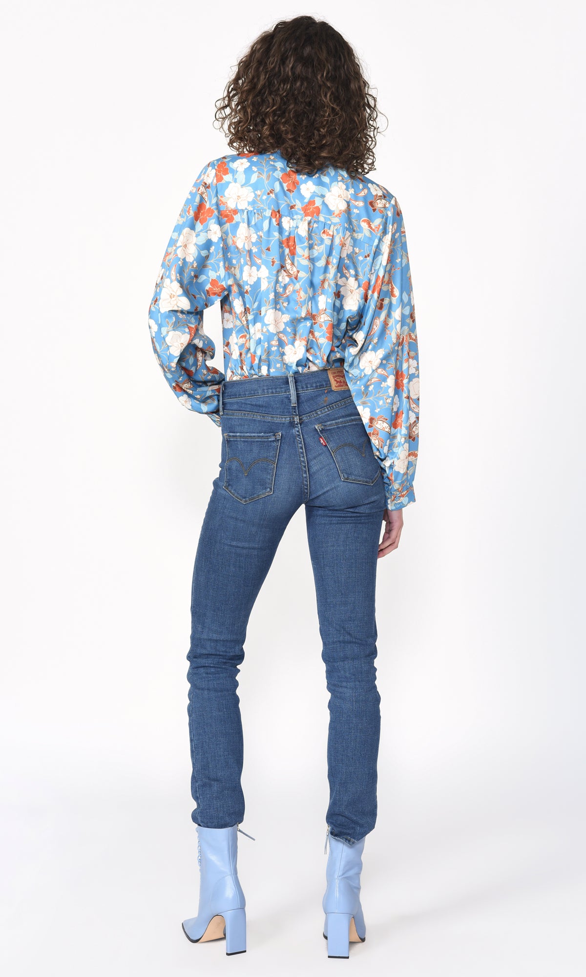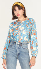 Shaped with flowy billowy long sleeves this floral print blouse features a button-up front placket, shirring along the shoulders and back.
