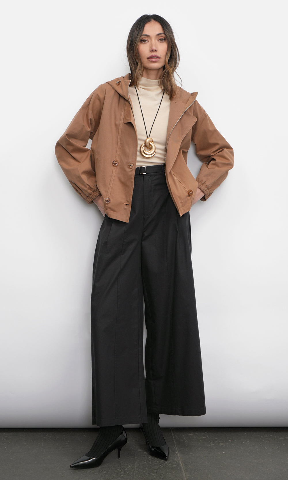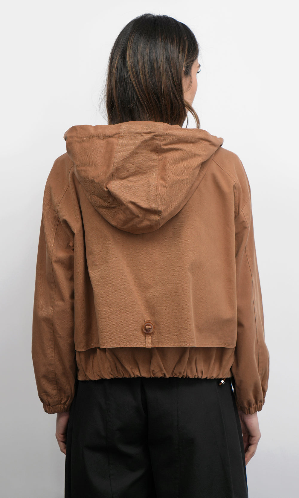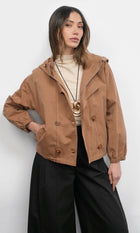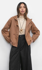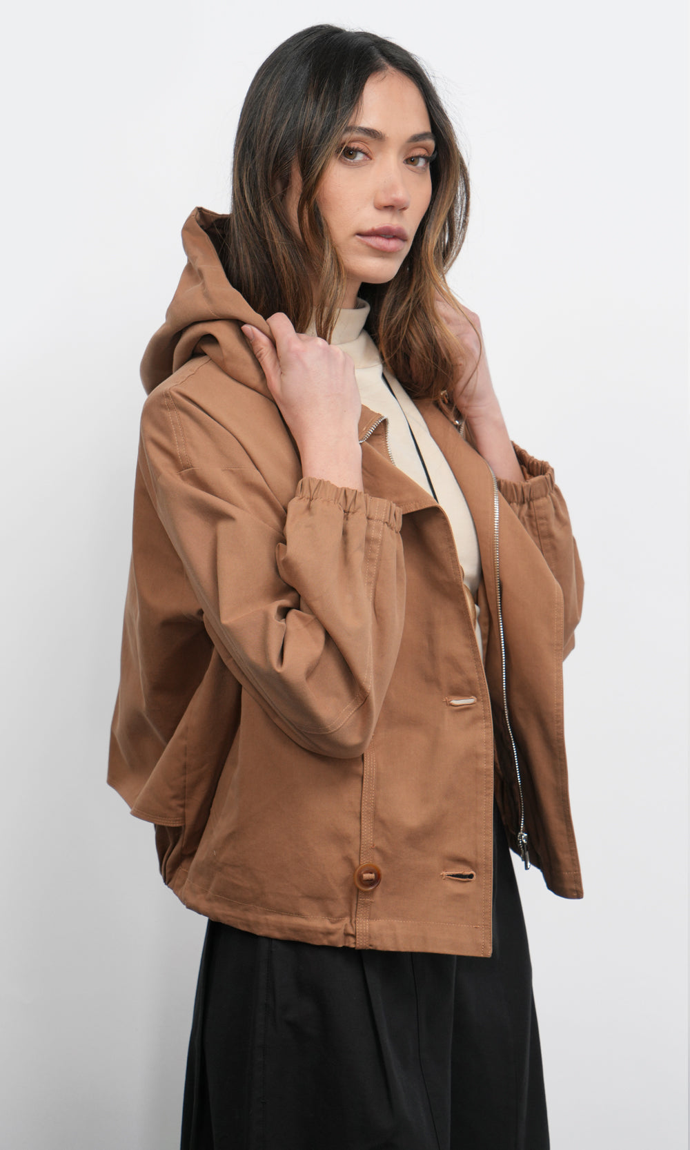 Crafted from a substantial yet soft twill fabric in a versatile camel hue (as seen in the image), this jacket effortlessly blends utilitarian inspiration with contemporary design. It features a unique funnel neck that cleverly integrates a discreet hood, offering both style and practicality.