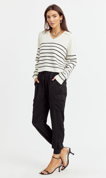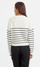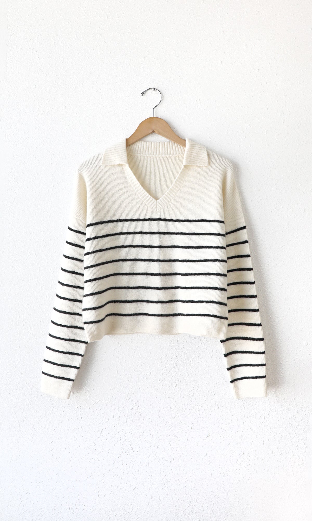 A lightweight sweater with a loose fit. It features classic stripes to match with any garment and an open collar sweater. It's a great piece for your wardrobe foundation for it's casual design that can be styled to your heart's content.