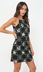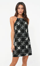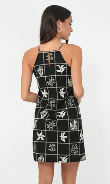 Constructed with a streamlined halter neckline and a tailored mini silhouette, this piece stands out with an allover embroidered floral grid pattern for a modern yet playful edge. The subtle back keyhole adds just the right amount of detail.