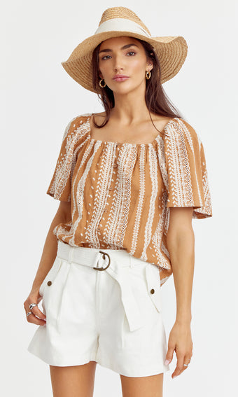 A loose-fit blouse featuring a square neckline and button-front closure. The tan pieces feature a striped, embroidered fabric.
