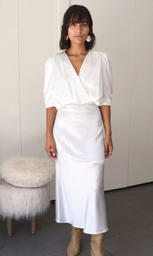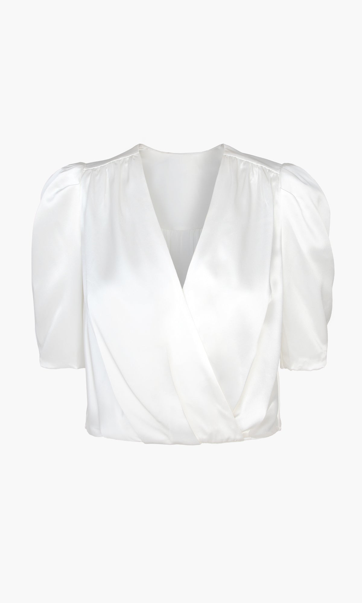 Your new go-to blouse - mee the Karis Short Sleeve Blouse. Featuring a faux-wrap front, puff sleeves with pleats along shoulders, a v-neckline with snap closure, and a back yoke. Fully lined.