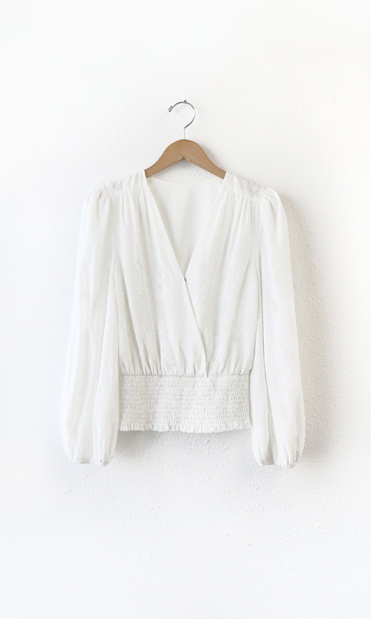Faux wrap over blouse with a smocked waist to for a flattering fit. Features puffed long sleeves. Fabric has a delicate embroidery pattern.