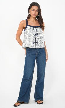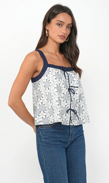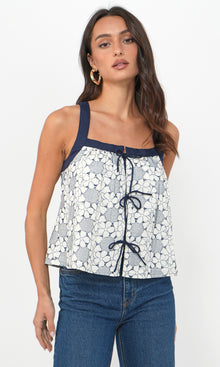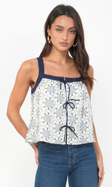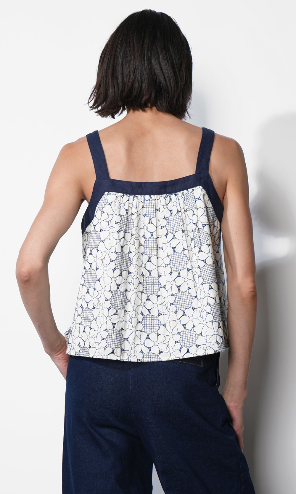 This top features a unique embroidered fabric with a delicate floral or geometric pattern in a contrasting color (appears to be white embroidery on a darker base, possibly navy or black, creating a two-tone effect). The design showcases a stylish square neckline framed by broad, solid-colored (likely navy) shoulder straps, which continue around the back to create a clean, contemporary look.