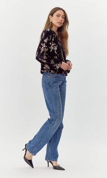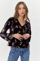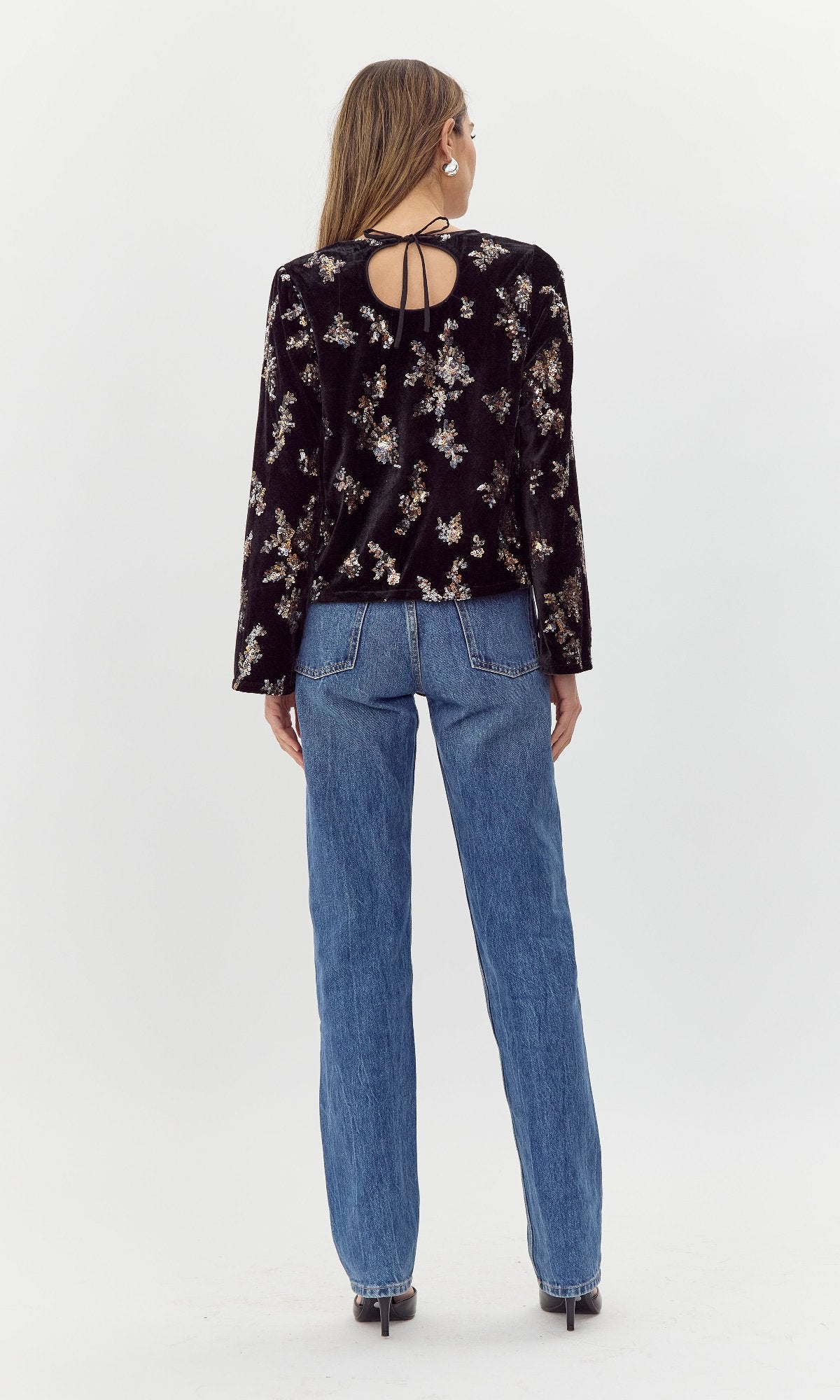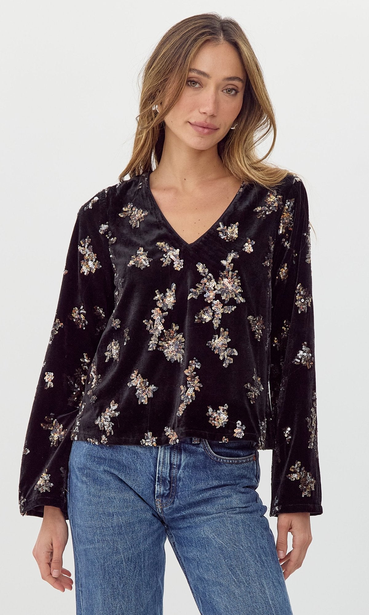 Velvet, loose-fit blouse introducing a sequin pattern. The structure features long sleeves and a V-neckline.