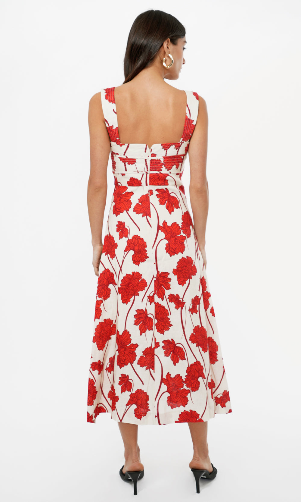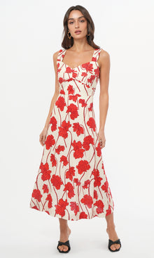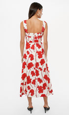 A bold floral statement in a refined silhouette, the Madi Linen Midi Dress is crafted from a breathable linen blend with a structured sweetheart neckline and wide straps. The fitted bodice features subtle pleating and a smocked back panel for flexible support, while the flared skirt moves with ease. The vibrant red poppy print brings striking contrast to the soft ivory base.