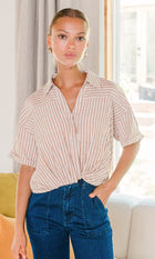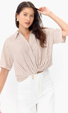 This button-down shirt features a cropped design and an elegant twist front detail. Its tan and ivory stripes add a fun touch to the overall look.