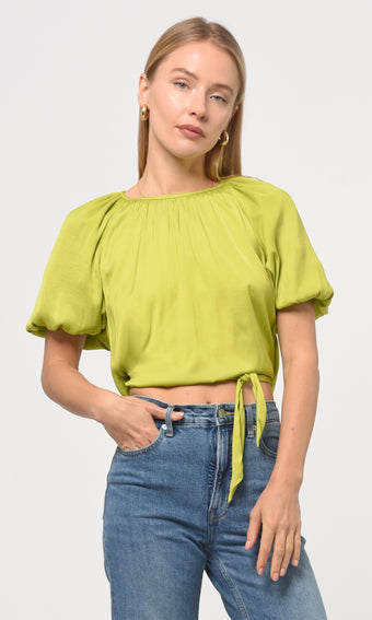 In a muted green, this balloon top is created to be dressed up or dressed down, during all seasons and occasions. The main traits of the garment are its tie-back design and puffy silhouette which makes wearing the piece loose and comfortable. This simple construction is flattering and stands out.