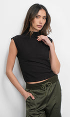 Crafted from a refined, finely ribbed knit fabric, this top offers a sleek and figure-flattering fit. It features an elegantly high funnel neck and a chic sleeveless design that is subtly enhanced by structured shoulders, creating a modern and polished silhouette.