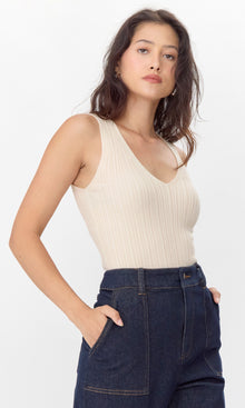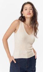 Fitted, knit tank top. Features a wide V-neckline and raw hem. A stretchy top that will never lose it's shape overtime.