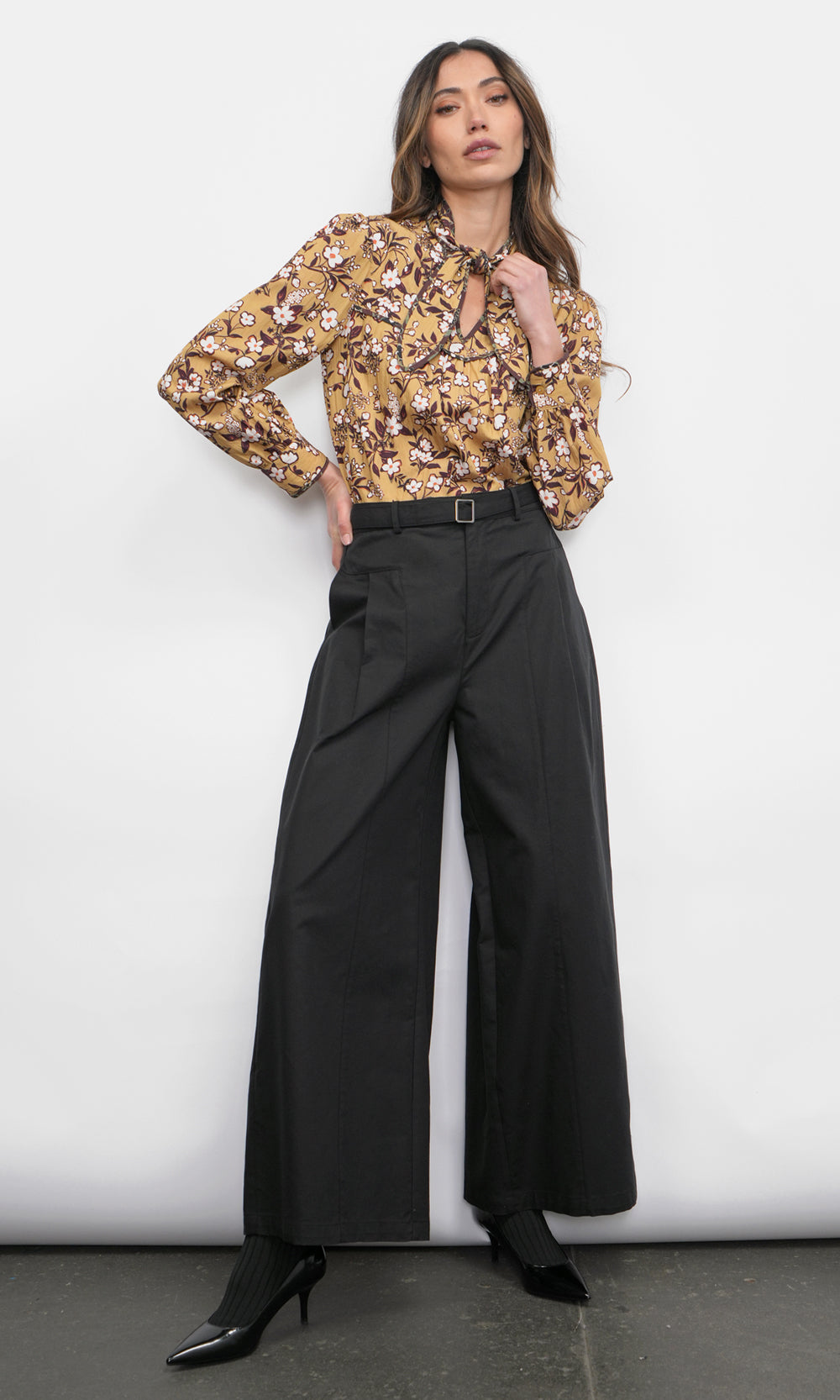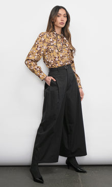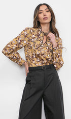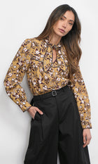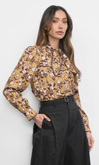 Crafted from a lightweight, fluid fabric, this exquisite blouse showcases a captivating floral print in a rich palette of mustard yellow (or camel), cream, and subtle burgundy accents.