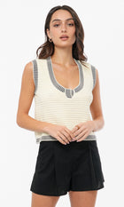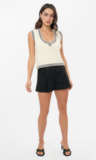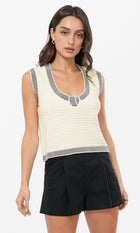 Crafted from a soft and breathable textured knit fabric, it features a subtle ribbed or woven pattern that adds depth and interest to its solid color (appears to be a versatile neutral, possibly a cream, light beige, or sand). The tank is designed with a classic scoop neckline and comfortable, wider shoulder straps, offering a flattering and secure fit.