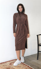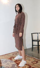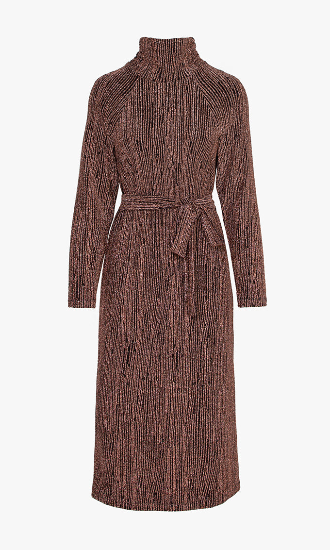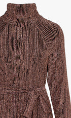Stretchy knit fabrication with lurex stripe pattern. Mock neck, long sleeve, relaxed fitted midi dress with a tonal matching waist tie.