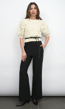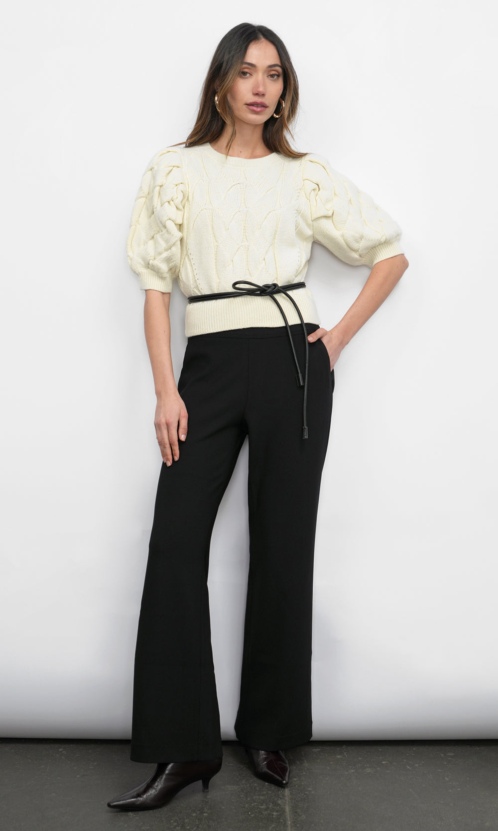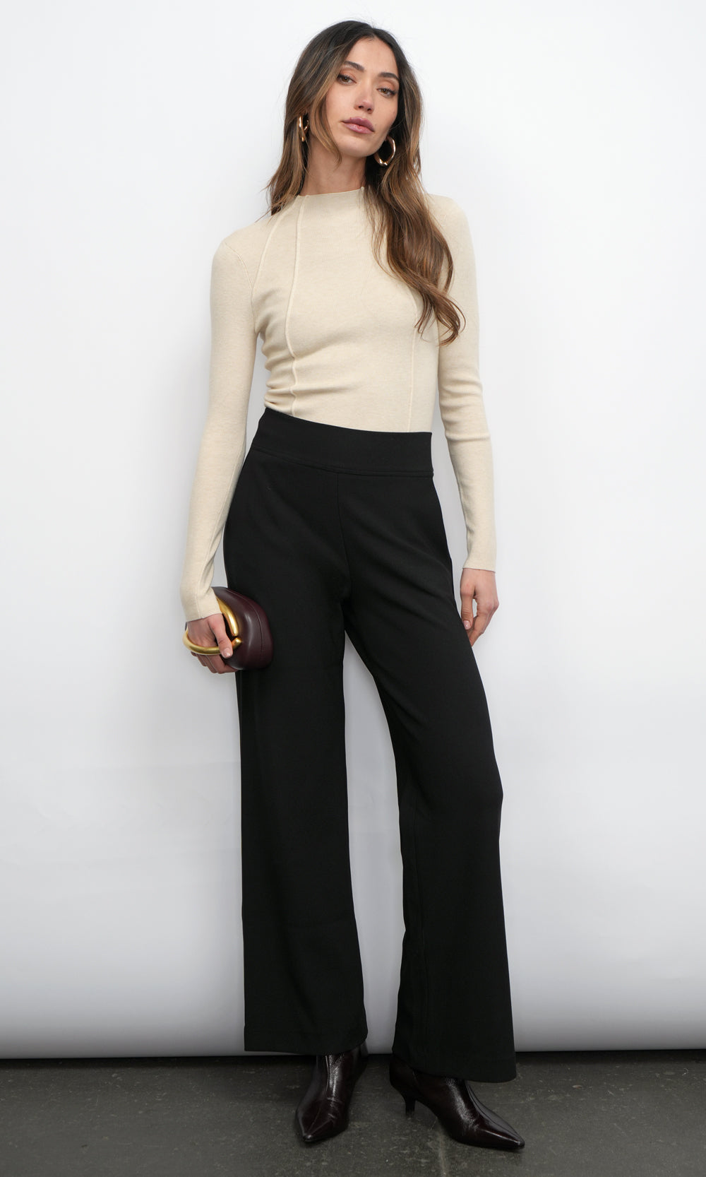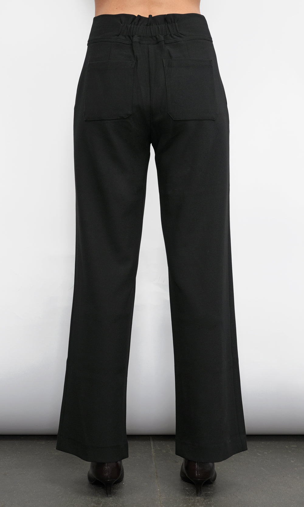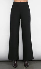 Crafted from a luxuriously soft knit fabric in classic black, these trousers offer a fluid, relaxed wide-leg silhouette that drapes beautifully. Featuring a comfortable elasticated waistband, they combine ease of wear with a polished aesthetic, making them an essential foundation piece for countless contemporary ensembles.