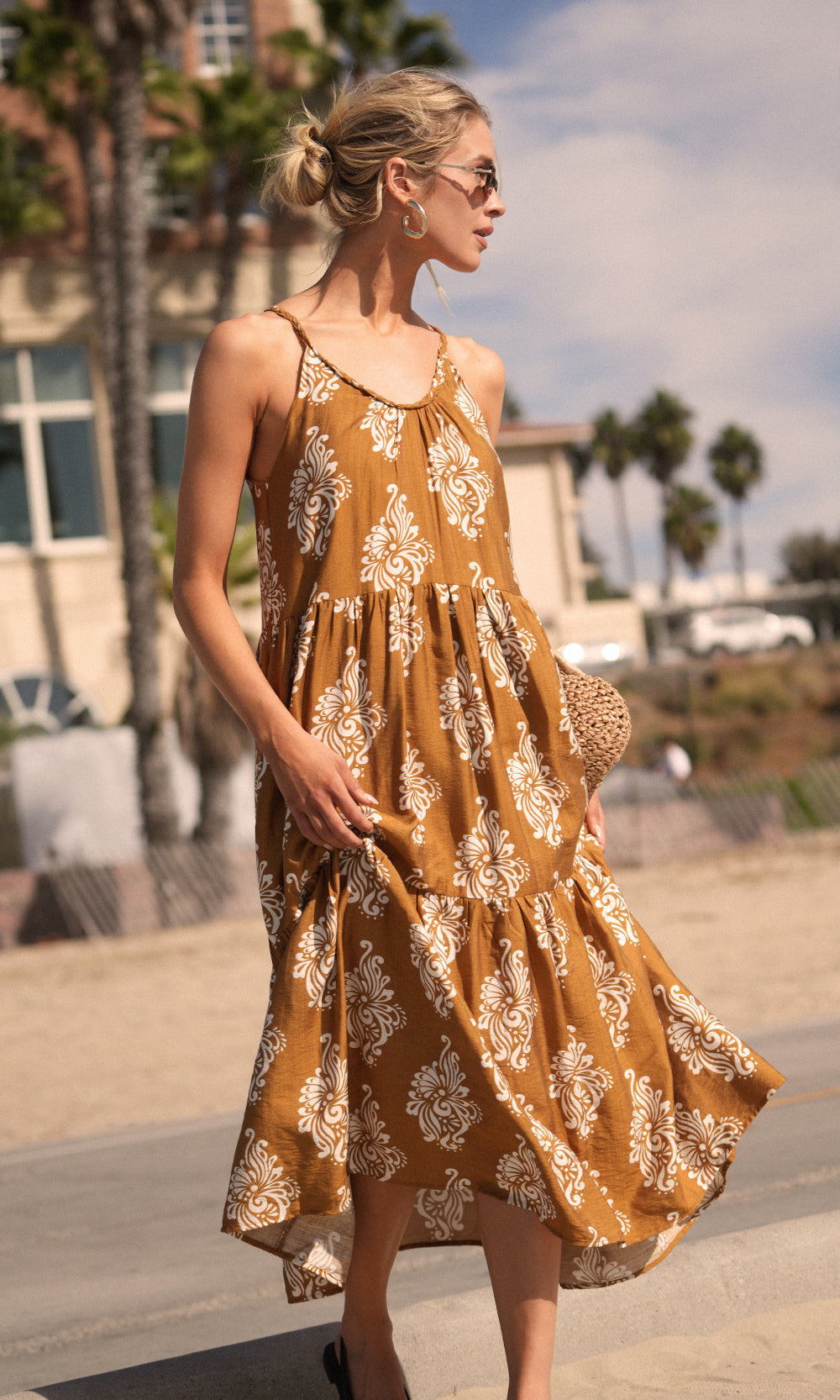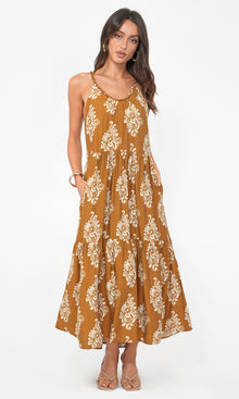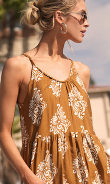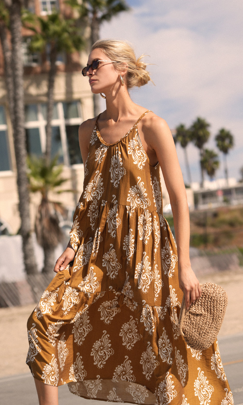 Designed in a rich, earthy print with an airy silhouette, this tiered midi is your go-to for warm days that call for a little polish. The braided shoulder straps and keyhole back bring subtle texture and movement, while the relaxed fit keeps it wearable from brunch to beachside walks. Side pockets offer function without compromising the flow.