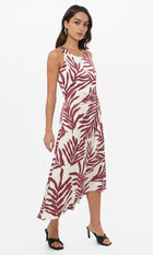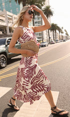 This captivating midi dress features a striking abstract leaf or botanical print in rich burgundy tones against a creamy white or off-white background, creating a vibrant, vacation-ready aesthetic. The design boasts a flattering halter-style neckline that gracefully frames the shoulders and décolletage.